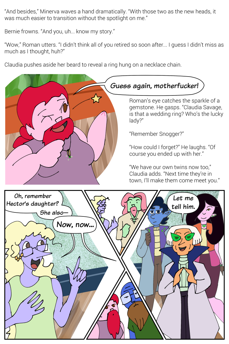Claudia pushes aside her beard to reveal a ring hung on a necklace chain. "Guess again, motherfucker!"