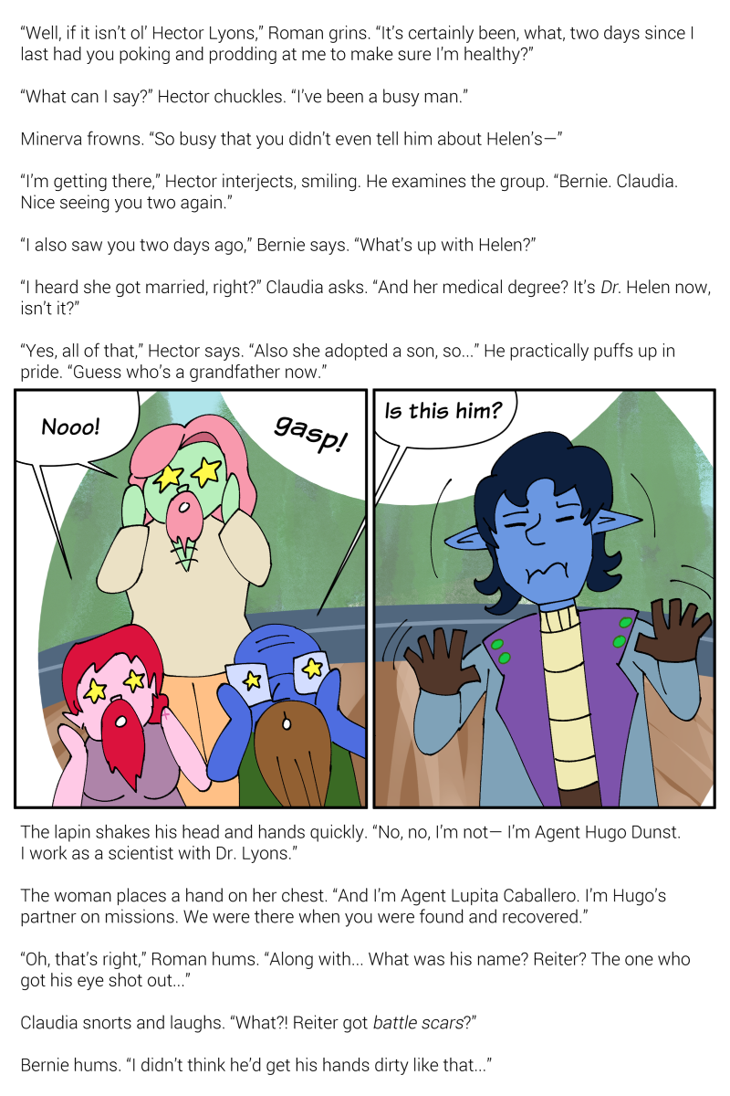 "Well, if it isn't ol' Hector Lyons," Roman grins. "It's certainly been, what, two days since I last had you poking and prodding at me to make sure I'm healthy?"